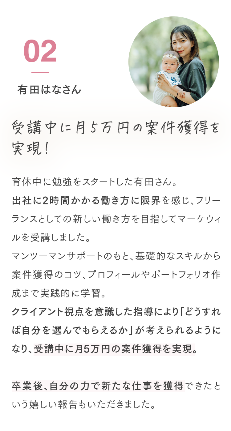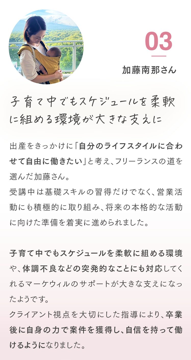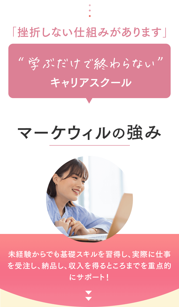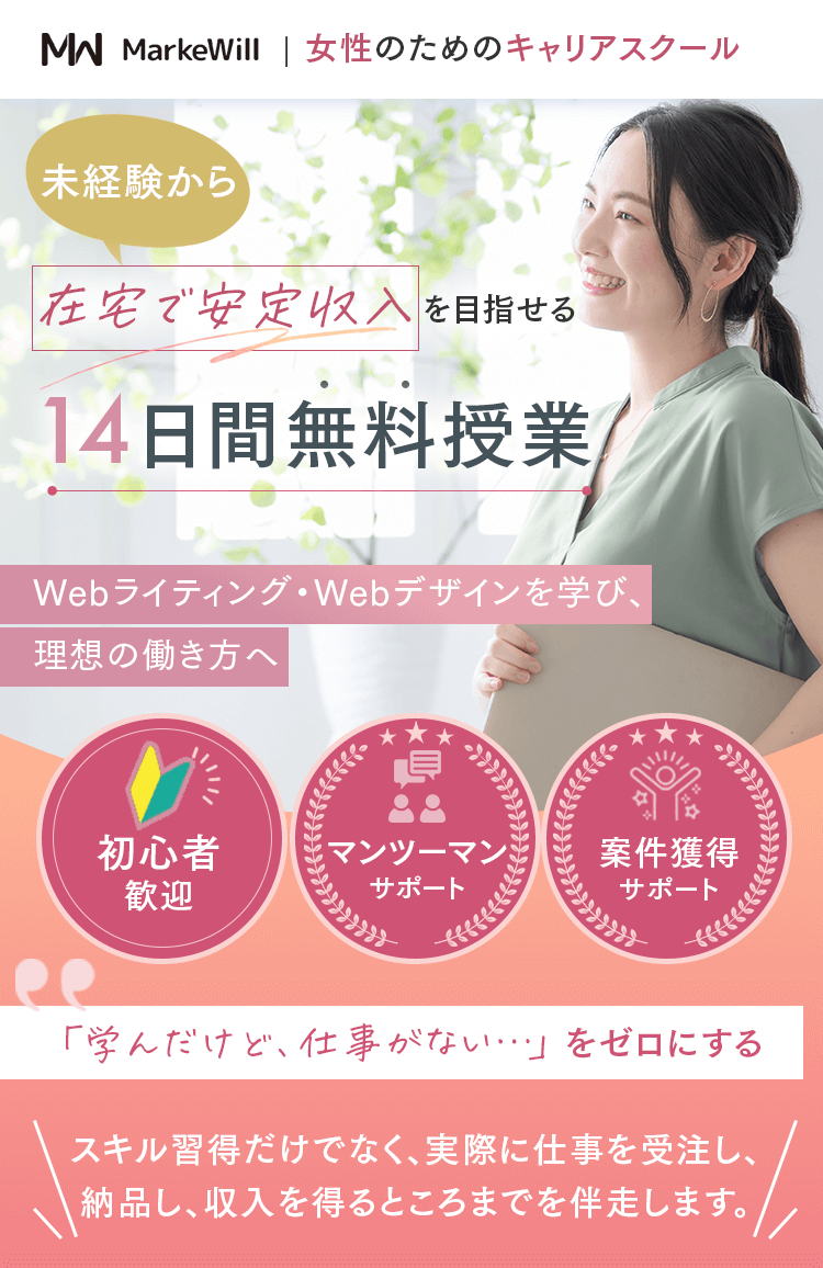 Q. オンラインのみの受講は可能ですか? はい、可能です。完全オンラインでの受講が可能です。 Q. 子育てと両立できますか? 1週間に学習する時間は、5~10時間が目安です。忙しい時でも、空いた時間を使えば受講を完了できます。講義の当日キャンセルも可能です。お子さんの急な体調不良などにも柔軟に対応しています。 Q. パソコンの操作に自信がないのですが大丈夫ですか? パソコン操作に自信がない方に向けてパソコン・ツールの使い方から解説しますのでご安心ください。 Q. 教材費等、追加の費用はかかりませんか? コース料金以外の費用は一切かかりません。 代表紹介 Sicuro株式会社 代表取締役 北山貴郁 「受講者が“稼ぐ力”を持ち、自分らしい働き方を実現できるように全力でサポートします」 「人々の自己実現を支え、ポジティブな感情で溢れる社会をつくる」という想いを胸に、マーケウィルを立ち上げました。仕事を通して得られる充実感は、単なる収入だけでなく、社会から必要とされる実感や一緒に頑張る仲間の存在によって生まれるものだと考えています。だからこそ、私たちは、「稼ぐ力」を育むことを軸に、受講者一人ひとりが自分らしい理想の働き方と収入を実現できるよう、全力でサポートしています。働き方の理想は人それぞれ。「子育てと両立しながら在宅で働きたい」「会社に縛られない自由な働き方がしたい」そんな想いを形にするために、ここで学ぶ時間が新しい一歩となれば嬉しいです。