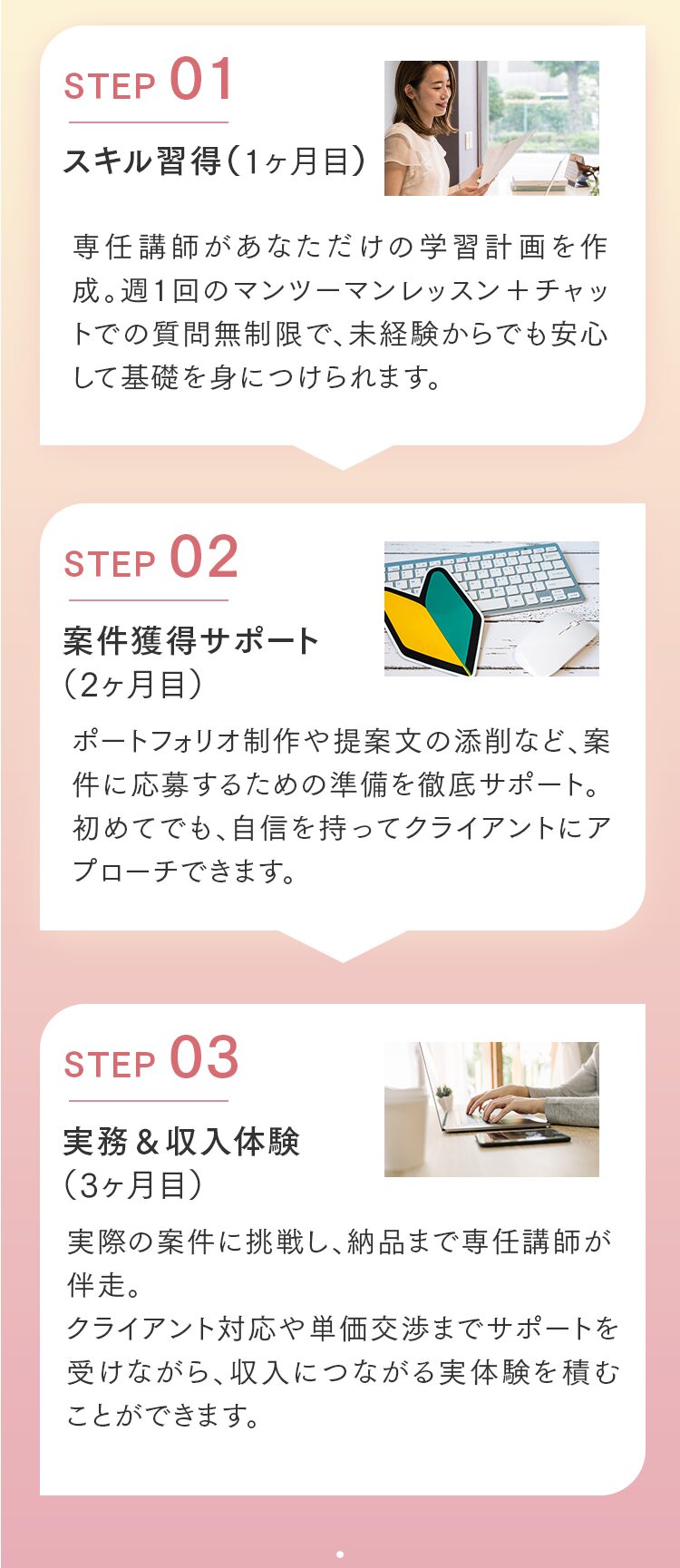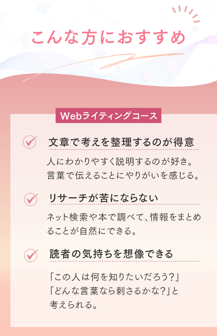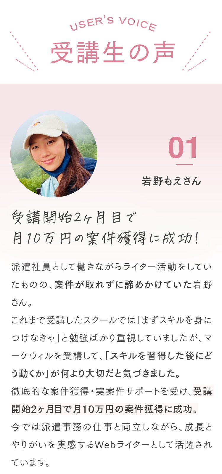 Q. オンラインのみの受講は可能ですか? はい、可能です。完全オンラインでの受講が可能です。 Q. 子育てと両立できますか? 1週間に学習する時間は、5~10時間が目安です。忙しい時でも、空いた時間を使えば受講を完了できます。講義の当日キャンセルも可能です。お子さんの急な体調不良などにも柔軟に対応しています。 Q. パソコンの操作に自信がないのですが大丈夫ですか? パソコン操作に自信がない方に向けてパソコン・ツールの使い方から解説しますのでご安心ください。 Q. 教材費等、追加の費用はかかりませんか? コース料金以外の費用は一切かかりません。 代表紹介 Sicuro株式会社 代表取締役 北山貴郁 「受講者が“稼ぐ力”を持ち、自分らしい働き方を実現できるように全力でサポートします」 「人々の自己実現を支え、ポジティブな感情で溢れる社会をつくる」という想いを胸に、マーケウィルを立ち上げました。仕事を通して得られる充実感は、単なる収入だけでなく、社会から必要とされる実感や一緒に頑張る仲間の存在によって生まれるものだと考えています。だからこそ、私たちは、「稼ぐ力」を育むことを軸に、受講者一人ひとりが自分らしい理想の働き方と収入を実現できるよう、全力でサポートしています。働き方の理想は人それぞれ。「子育てと両立しながら在宅で働きたい」「会社に縛られない自由な働き方がしたい」そんな想いを形にするために、ここで学ぶ時間が新しい一歩となれば嬉しいです。